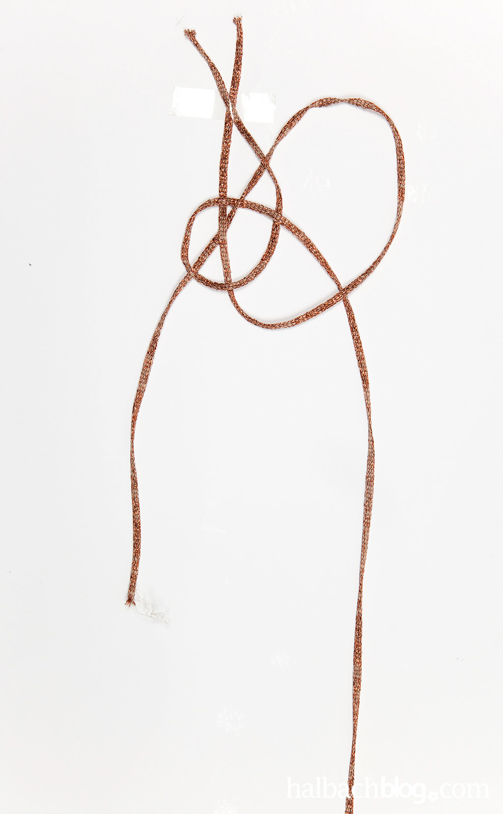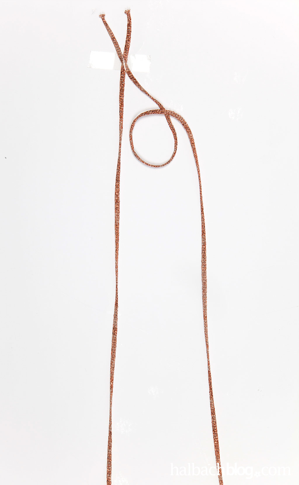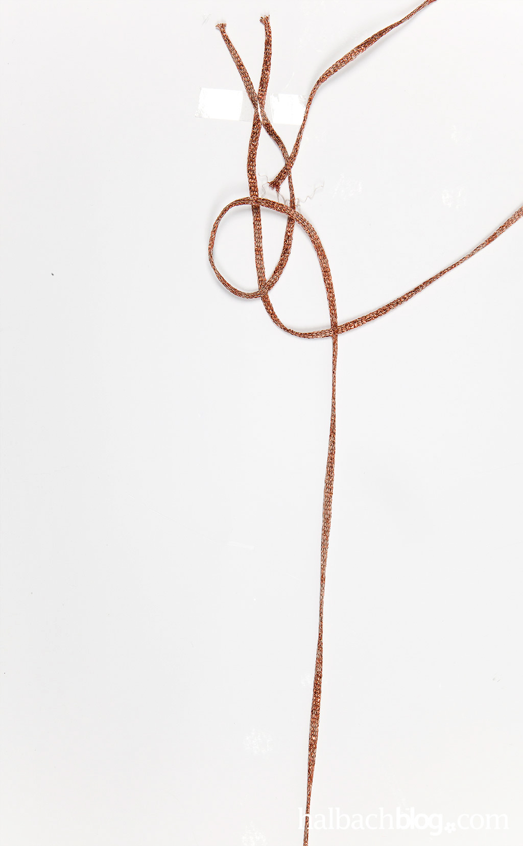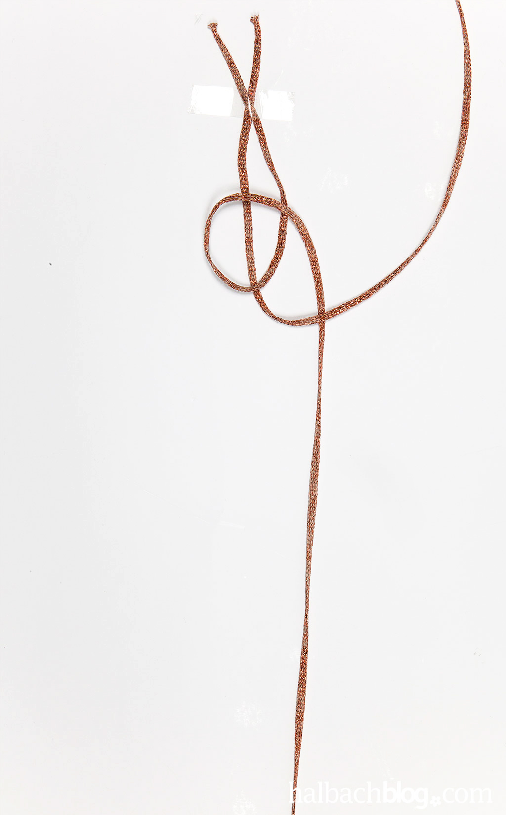 Damit die beiden Glitzer-Kordeln nicht immer aus den Fingern flutschen, könnt ihr sie gebündelt auf dem Tisch befestigen. Nun wird mit der rechten Kordel eine Schlaufe von unten nach oben rechts gelegt. Die linke Kordel wird anschließend unter die Schlaufe, jedoch über das Ende der rechten Kordel gelegt.