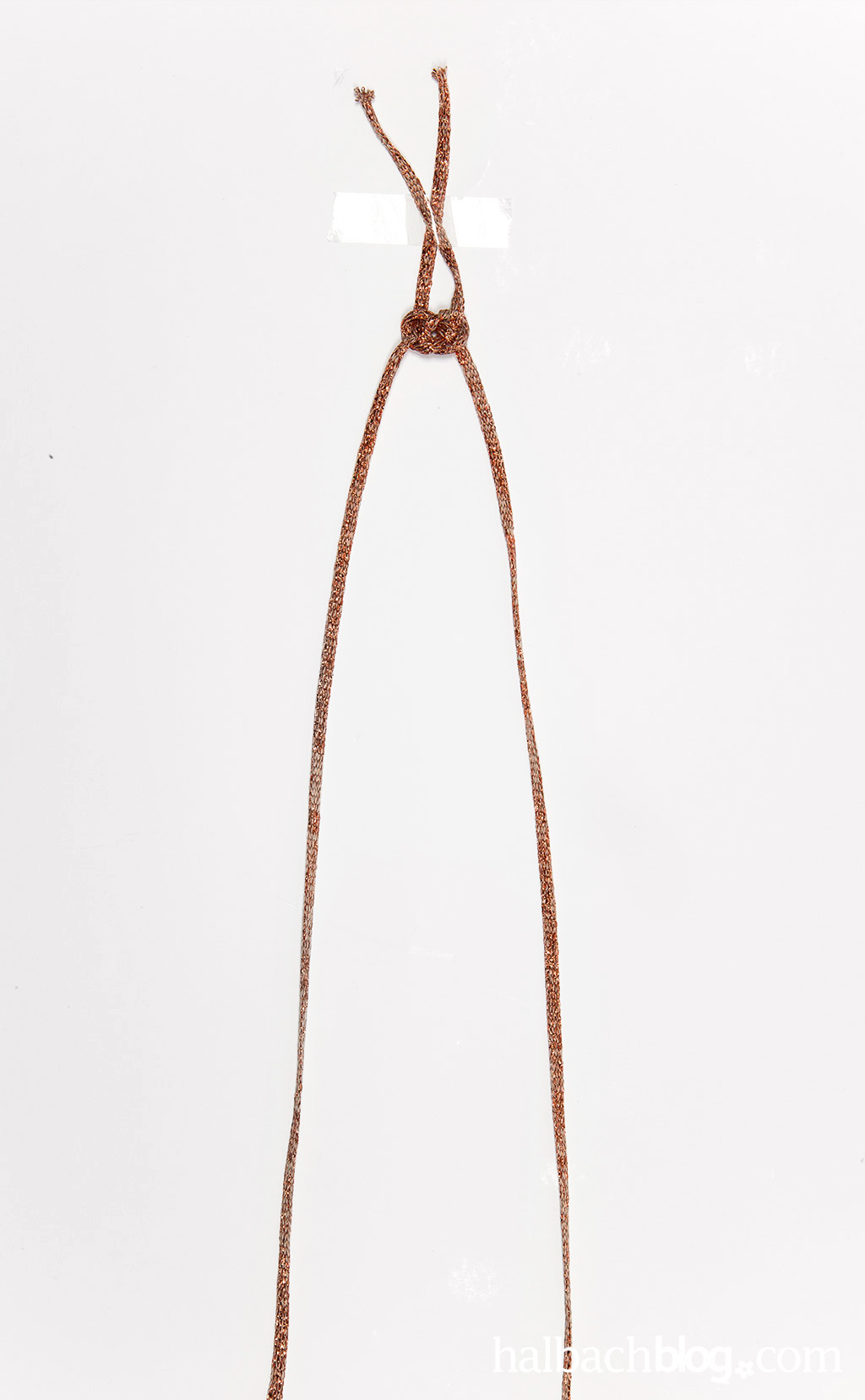 Um den Knoten zu vollenden, wird die linke Kordel von oben durch die Schlaufe gefädelt, erst oben, dann unten und wieder oben. Jetzt muss der Seemannsknoten nur noch festgezogen und zurecht gerückt werden. Für den luftigen Look wird zwischen den einzelnen Knoten etwas Platz gelassen.