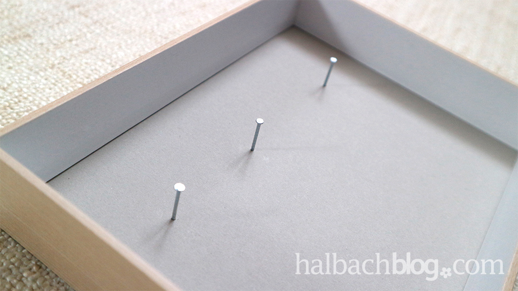 Und so wird der Bilderrahmen-Kalender gemacht: Um die Pappe auf die richtige Größe zurecht zu schneiden, nehmt am Besten das Passepartout aus dem Bilderrahmen heraus und übertragt die Außenmaße auf die Pappe. Anschließend die Pappe ausschneiden und die Position der Hangtags darauf markieren. Achtet dabei auf den gleichen Abstand zu den Rändern und darauf, dass zwischen Datum und Monat ein etwas größerer Abstand ist, als zwischen den Zahlen an sich. Nehmt jetzt das Glas aus dem Rahmen raus und legt dafür die Pappe ein, die Markierungen für die Nägel sollten dabei natürlich vorne zu sehen sein. Bilderrahmen schließen und die Nägel an die markierten Stellen rein hämmern, aber weit genug raus stehen lassen, sodass die Hangtags daran aufgehängt werden können.