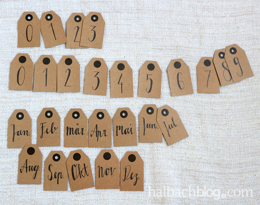Weiter geht´s mit den Hangtags. Fangt mit dem Bleistift an, die Zahlen und die Monate auf die Hangtags zu schreiben, so habt ihr noch die Möglichkeit etwas auszubessern. Seid ihr zufrieden, nehmt den Filzstift und zieht damit alles nach. Wer mag, kann auch noch etwas verzieren :-)