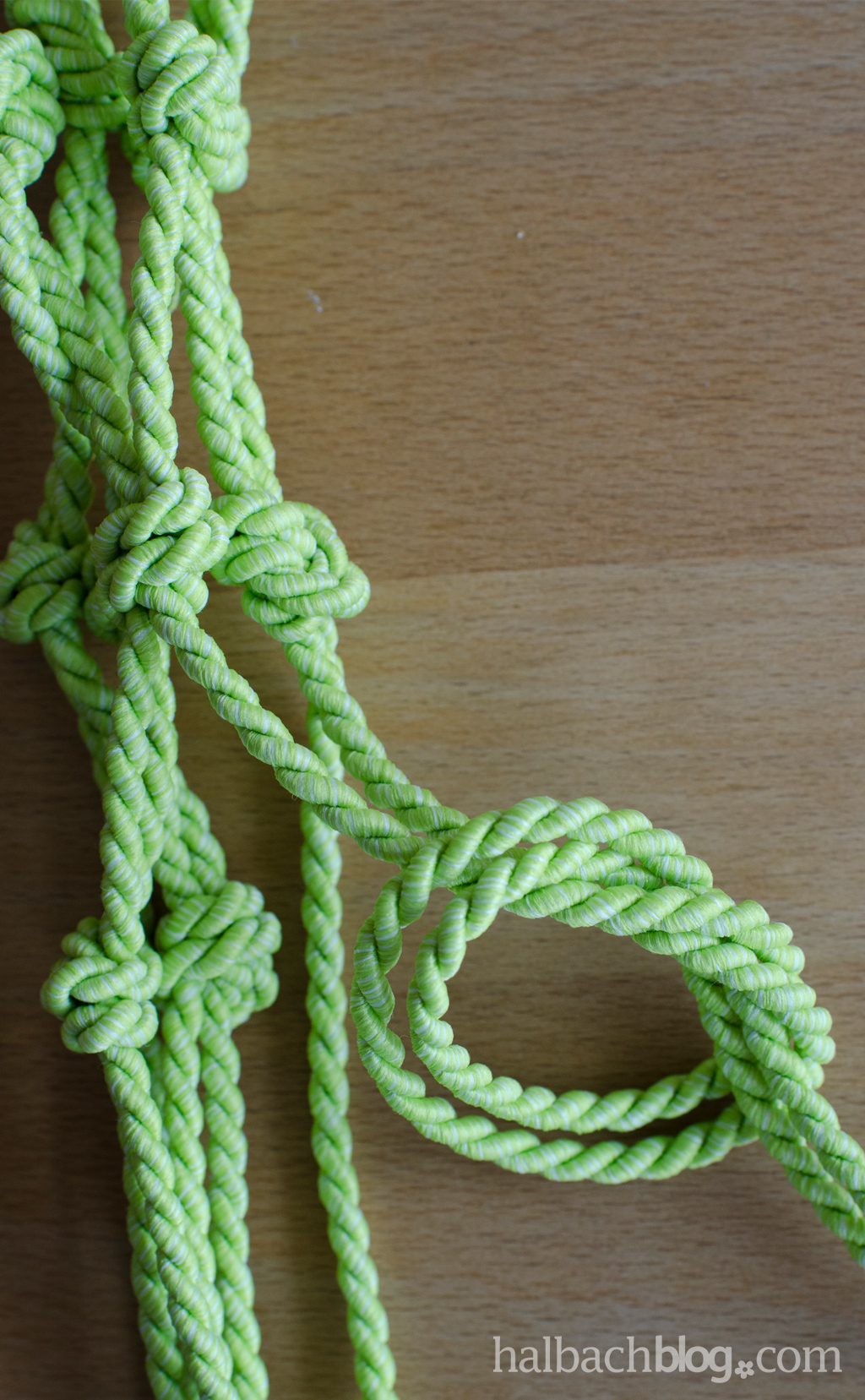 Der Makramee-Knoten geht so {mir hat beim Knoten die Vorstellung von einer großen Brezel geholfen, wenn man’s einmal raus hat, ist es wirklich easy!}: