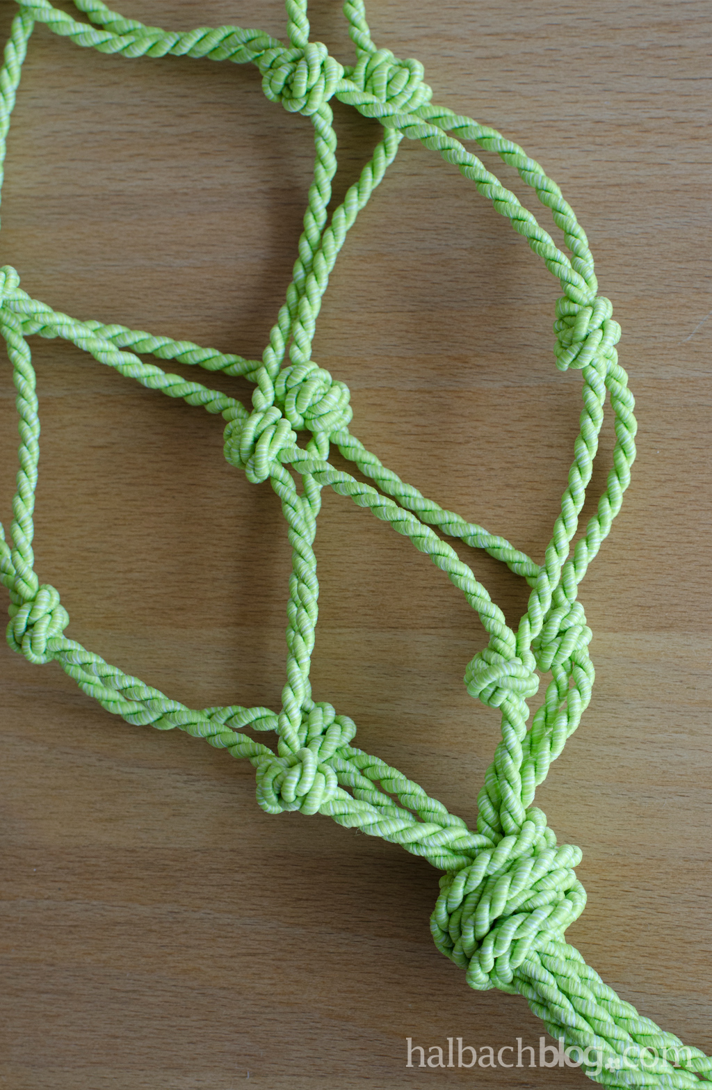 - die Schnüre auf gleicher Höhe zusammenfassen und das Netz mit einer Wicklung verschließen {mit einem dicken Knoten geht’s auch}