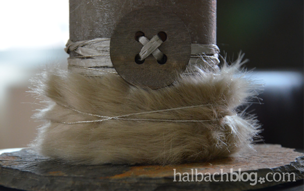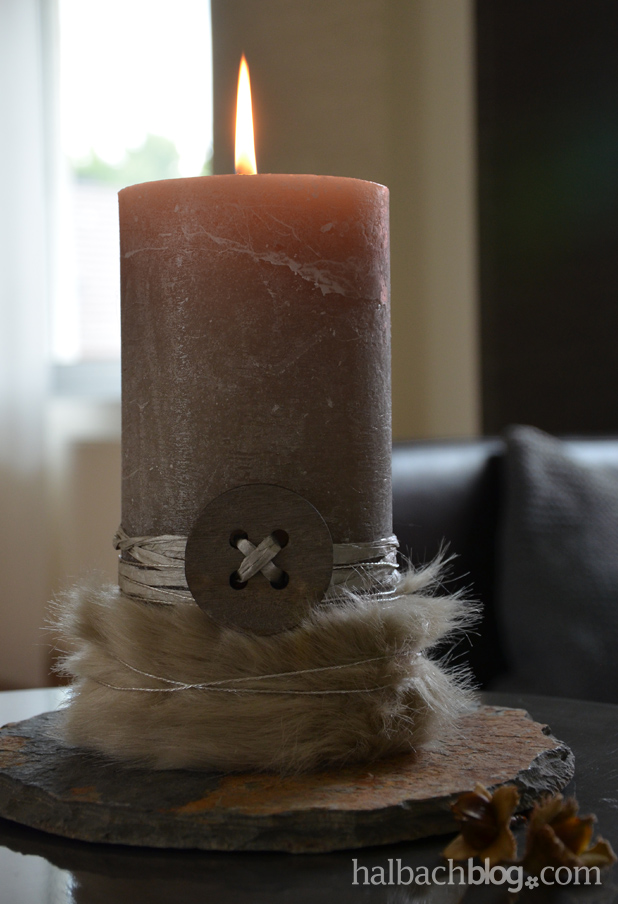 - Fell um die Kerze legen, mit einem Punkt Heißkleber fixieren oder mit einer Stecknadel befestigen (sieht man kaum, so lässt sich das Fellstück noch mal benutzen)