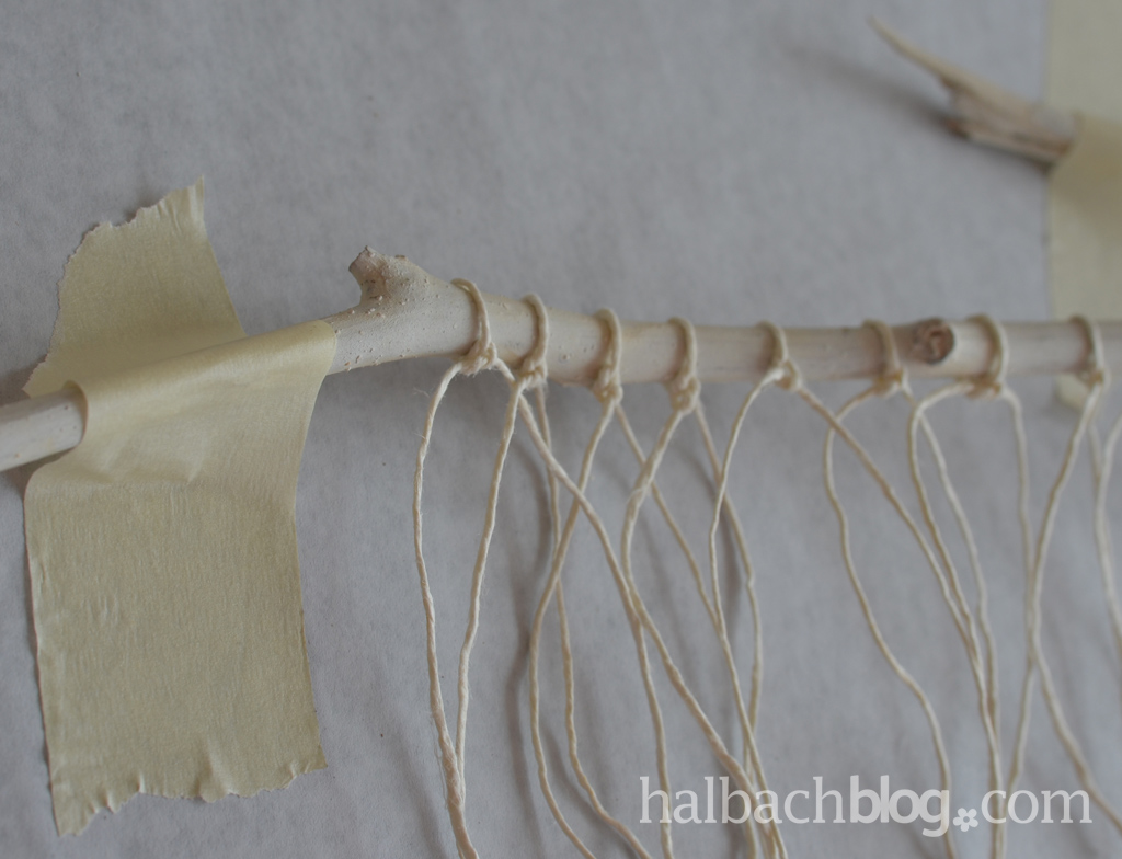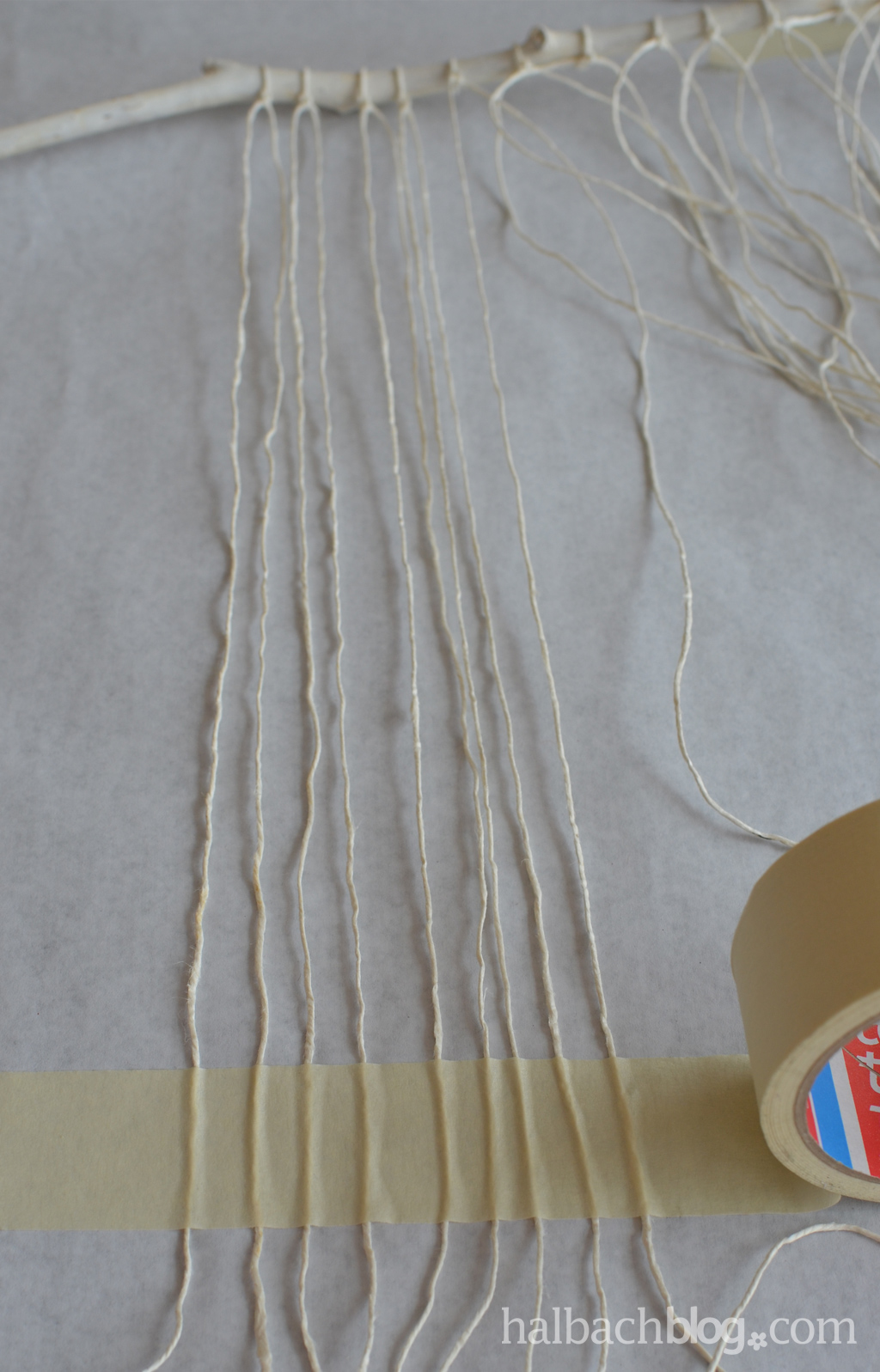 - die Fäden in gleichmäßigen Abständen mit einem Doppelknoten an den Ast knoten, so dass die Enden gleichlang abhängen