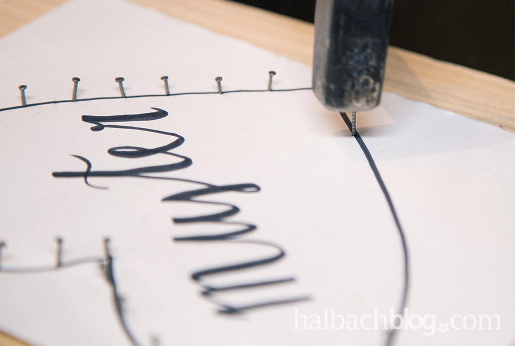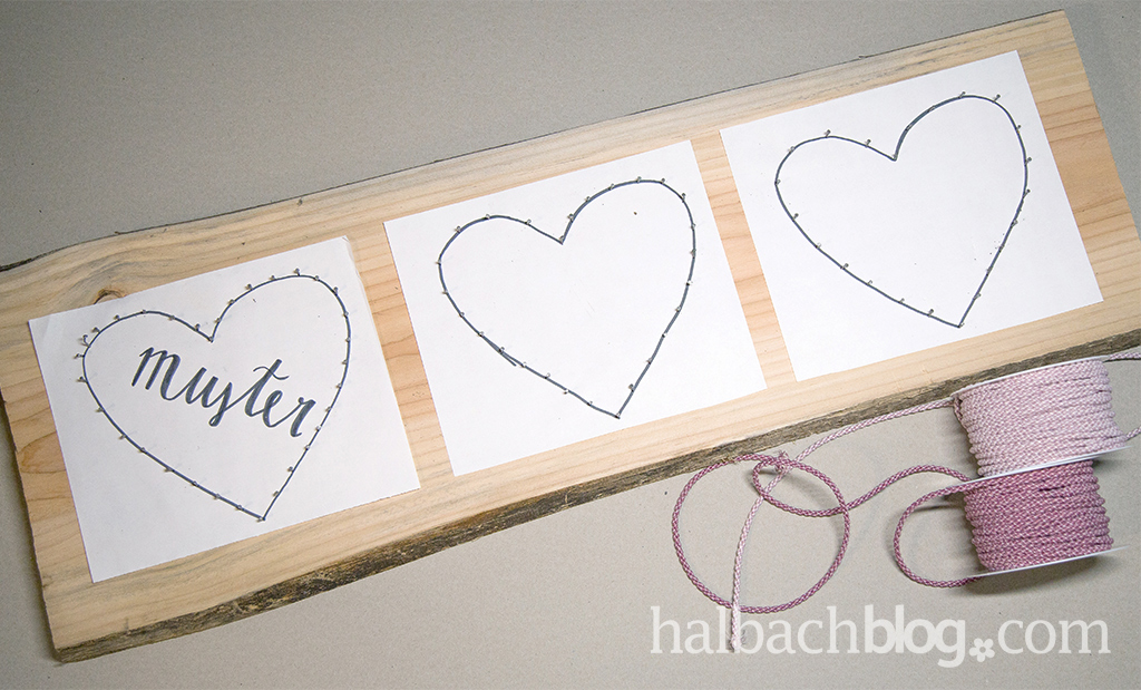 Nagelt nun entlang der Linie der Herzen und achtet dabei auf einen relativ gleich großen Abstand der Nägel. Bei dickerer Kordel sollte ein größerer Abstand gewählt werden, als bei dünnem Faden. Wir haben bei einer Kordeldicke von 4 mm jeweils einen Abstand von ca. einem Zentimeter gehalten. Um genug Platz zum Wickeln zu haben, sollten die Nägel weit genug raus stehen, sodass die Kordel mindestens zwei mal darum gewickelt werden kann.