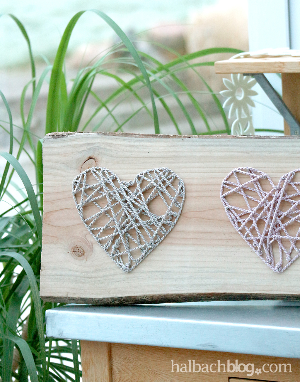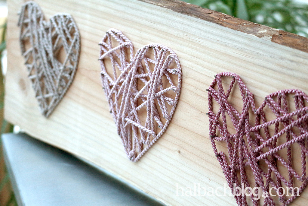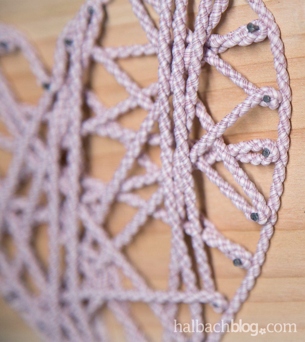 Jetzt geht´s der Kordel an den Kragen. Bevor ihr sie abschneidet, klebt einen Streifen Tesafilm um die Stelle, an der ihr schneidet. So besteht keine Gefahr, dass die Kordel ausfranst oder aufdreht. Die Länge der Kordel messt ihr am Besten vor dem Abschneiden grob ab. Wir haben ca. 1,5 m von jeder Kordel gebraucht. Der Kordelanfang wird an der unteren Spitze des Herzens angeknotet und von da aus wird einfach los gesponnen, bis alle Nägel ein- bis zweimal umwickelt sind. Um dem Herz die richtige Form zu geben, legt ihr die Kordeln einmal ums ganze Herz herum, sodass eine schöne Kontur entsteht. Das Kordelende webt ihr ein wenig ein, schneidet es ab und klebt es an einer wenig sichtbaren Stelle am Holz fest.
