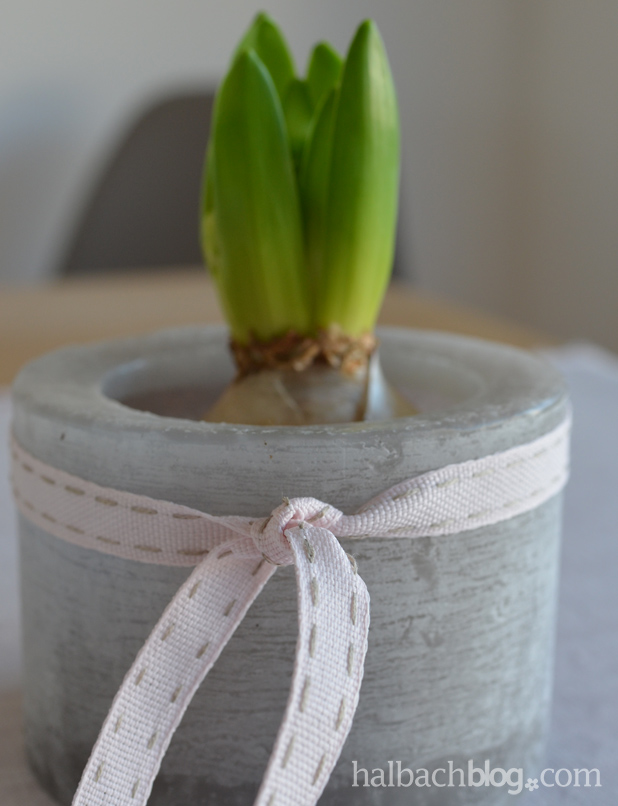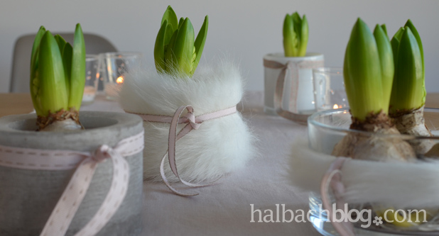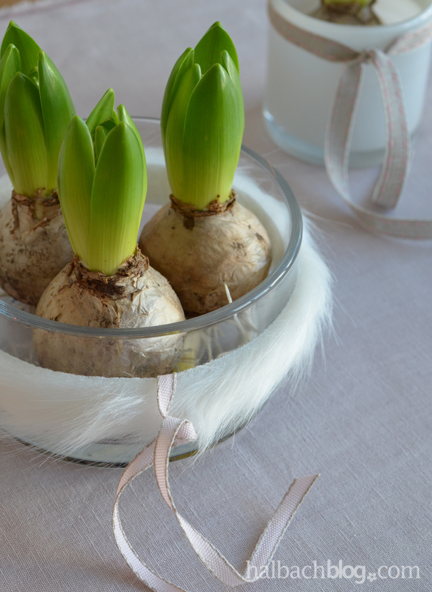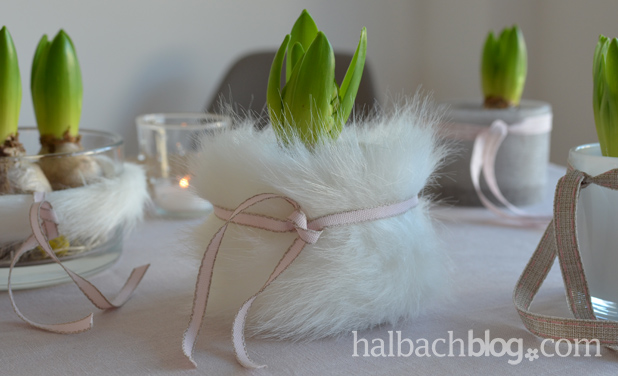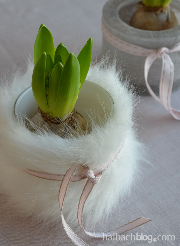 Auch bei uns ziehen bereits in den ersten Januartagen die ersten Hyazinthen und Tulpen ins Wohnzimmer ein. Deine Idee die Pflanztöpfe mit den weißen, flauschigen Materialien zu umhüllen gefällt mir sehr gut!