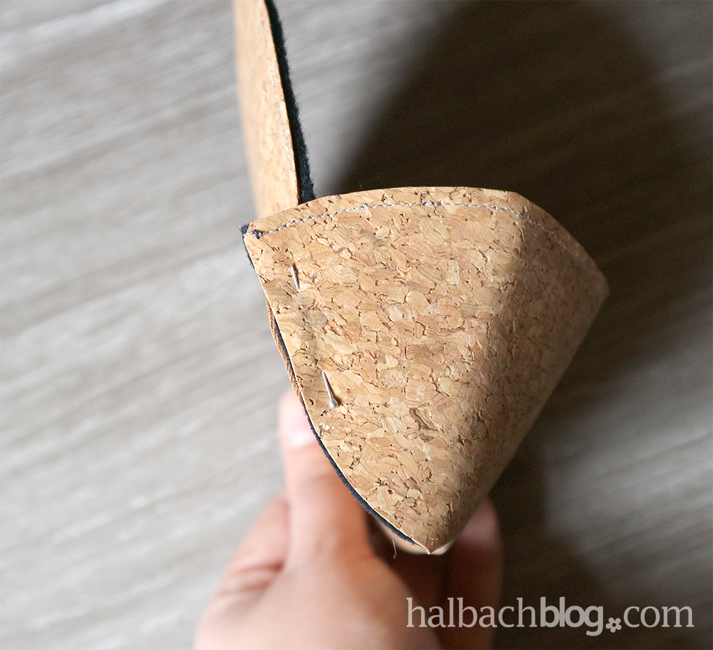 Anschließend steckt ihr die noch nicht vernähten Teile wie auf dem Bild ab, sodass die Form des Brillenetuis erkennbar wird. Da jetzt der Korkstoff außen liegt, haben wir den hellgrauen Faden als Ober- und Unterfaden gewählt.