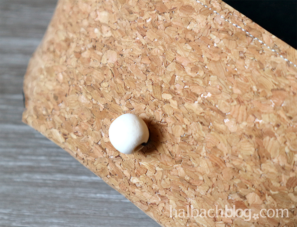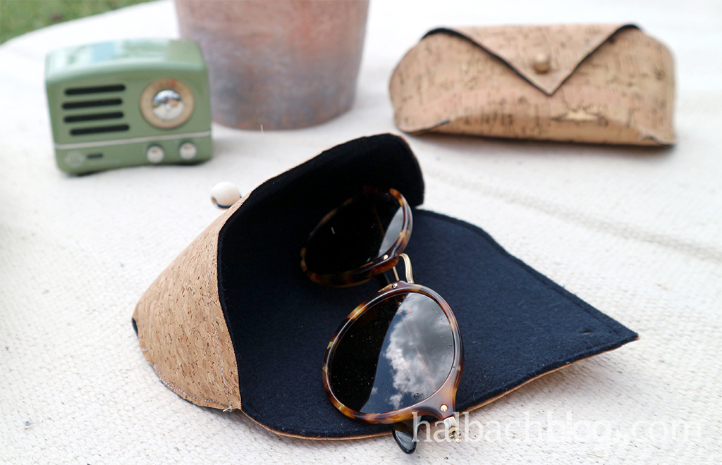 An der Spitze des Deckels wird der Verschluss angebracht. Wir haben uns für eine Perle entschieden, ihr könnt aber auch einen Druckknopf oder einen anderen Verschluss anbringen. Für die Perle stanzt ihr ein kleines Loch mit der Lochzange an der eingezeichneten Stelle (Schnittmuster) und schneidet es so weit aus, dass die Perle gerade so hindurch passt. Um die Position der Perle zu bestimmen, klappt ihr das Etui zu und zeichnet durch das Loch eine Markierung für die Perle. An dieser Stelle noch schnell die Perle von Hand annähen und jetzt Sonnenbrille in´s Korkstoff Brillenetui einpacken und raus in die Sonne! :-)