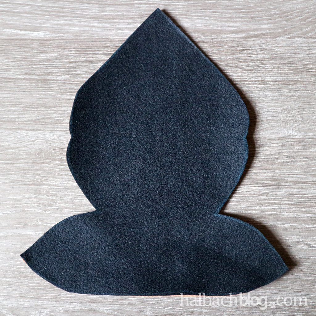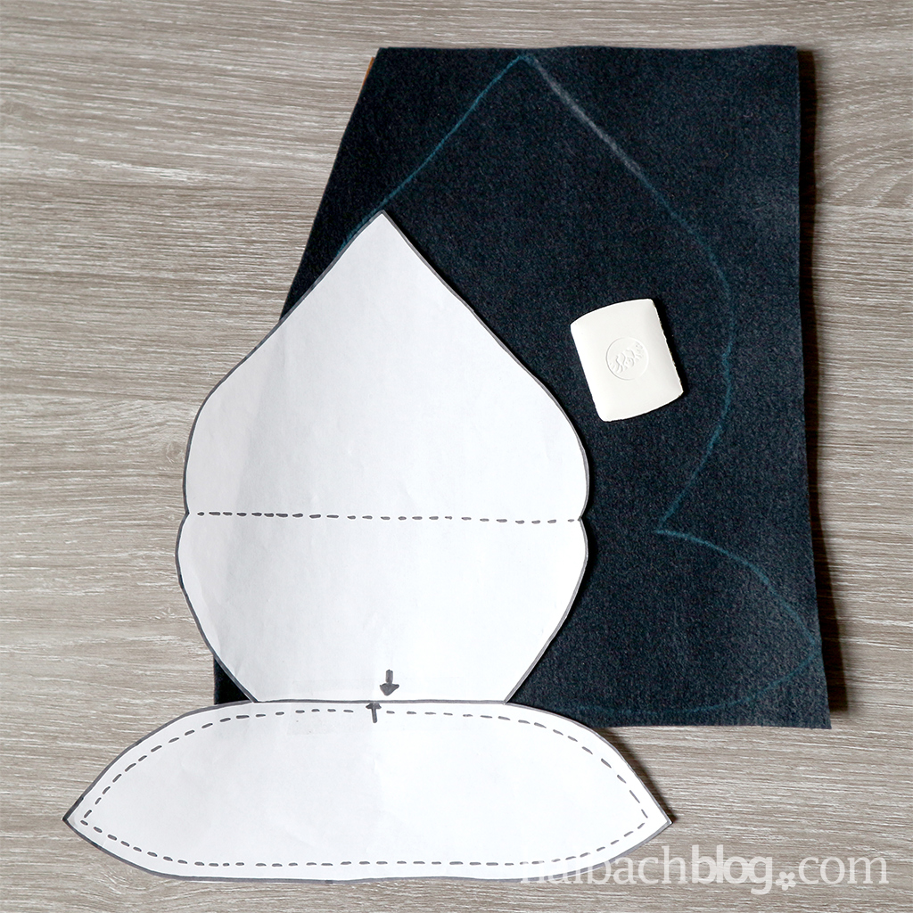 Jetzt das Schnittmuster auf den Filz übertragen und beide Stoffe zusammen ausschneiden. Dabei ist Genauigkeit sehr wichtig. Die Pappe wird zwischen den Korkstoff und den Filz an der vorgesehenen Stelle mit etwas Klebeband fixiert (benutzt hier aber nur wenig Klebeband, am Besten nur am Rand, damit es beim nähen nicht stört).