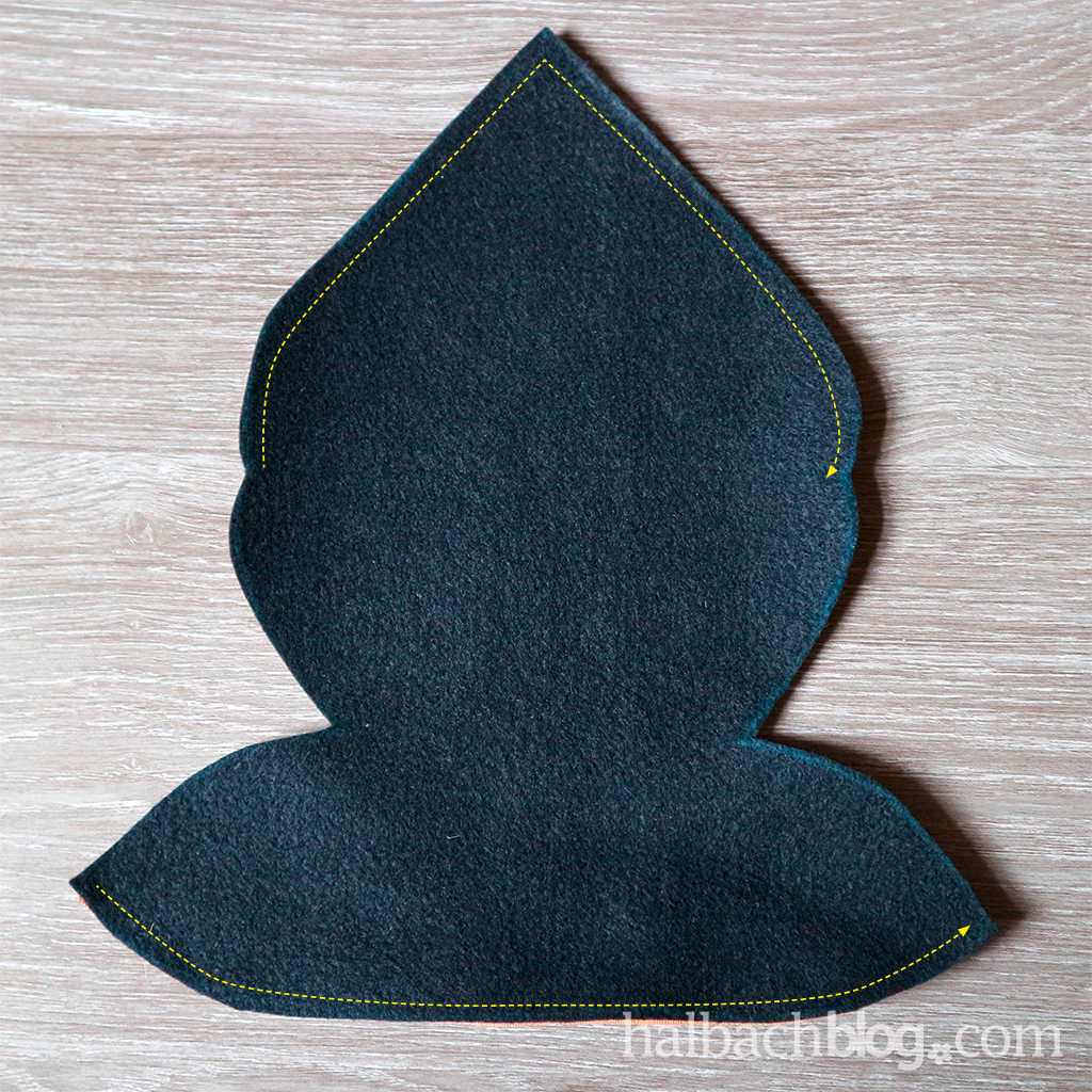 Und jetzt endlich ran an die Nähmaschine! ;-) Wir haben uns für einen hellgrauen Faden für den Korkstoff (Unterfaden) und einen dunkelblauen auf dem Filz (Oberfaden) entschieden. Näht damit wie im Bild eingezeichnet und lasst ca. 3 mm Nahtzugabe.