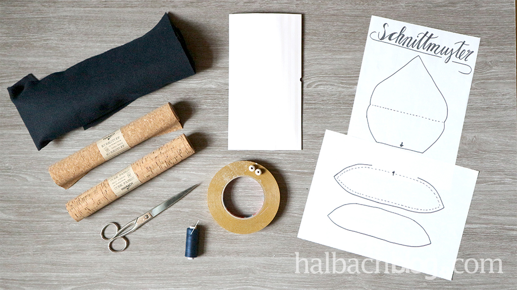 Als erstes druckt ihr euch das Schnittmuster in Originalgröße aus und schneidet es sauber aus. Nun muss es an den Pfeilen zusammen geklebt werden. Bevor das Schnittmuster auf den Stoff übertragen wird, klebt ihr den Korkstoff und den Filz provisorisch mit doppelseitigem Klebeband aneinander. Lasst dabei den unteren Teil, in den die Pappe gelegt wird, frei.