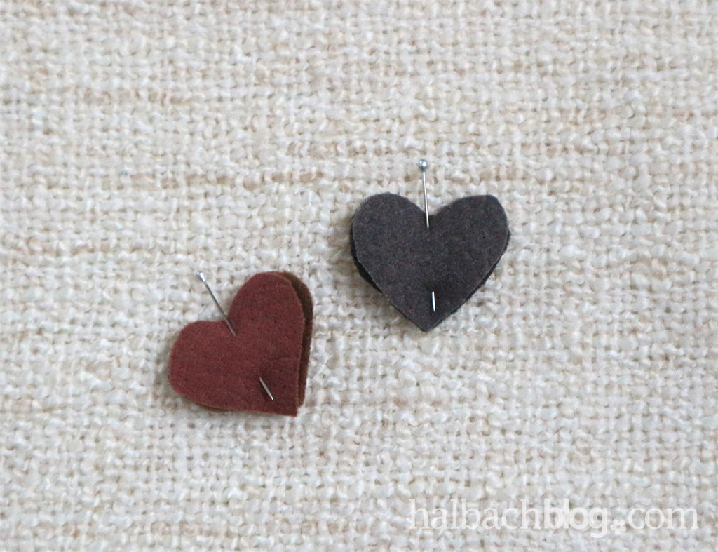 Zeichnet euch auf Pappe/Papier ein Herz auf, dessen Spitze einen rechten Winkel hat (90°). Die Größe der Herzen kann variieren, ganz wie ihr es mögt. Unsere sind ca. 2,5 cm hoch. Nun übertragt ihr das Herz zweimal auf den Kunstlederstoff, schneidet diese aus und fixiert sie mit Stecknadeln aufeinander. Ihr näht (von Hand oder mit der Nähmaschine) die rechtwinkligen Kanten des Herzes aufeinander, die Rundungen bleiben offen. Schon ist euer neues Kunstleder Lesezeichen fertig! :-)