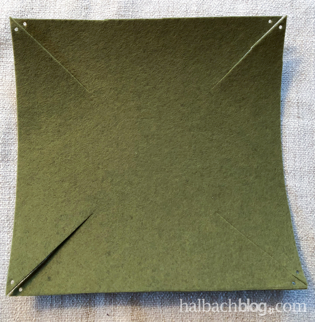 Nun schneidet ihr den Filz von den Ecken aus in die Mitte ein. Markiert euch das am Besten mit Lineal und Bleistift, damit ihr auch wirklich Richtung Mitte kommt. Die Schnitte macht ihr aber nur bis ca. zur Hälfte, wie oben auf dem Bild zu sehen.