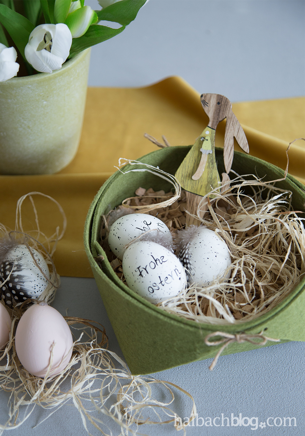 So könnt ihr ganz easy ein süßes Osternest aus Filz für eure bemalten Eier binden. Ein paar Tulpen und einen Hasenstecker dazu und fertig ist die Osterdeko!