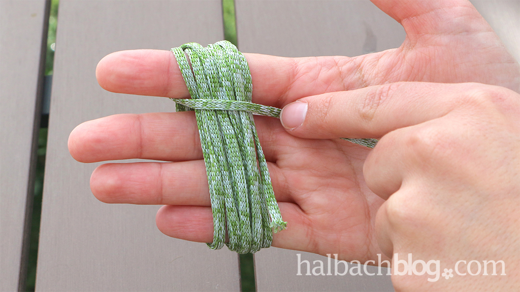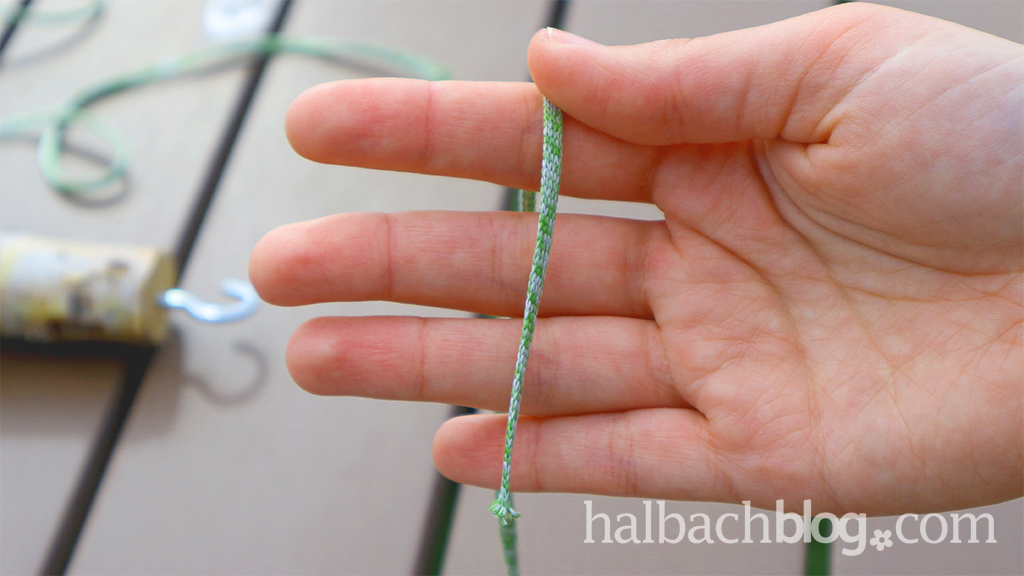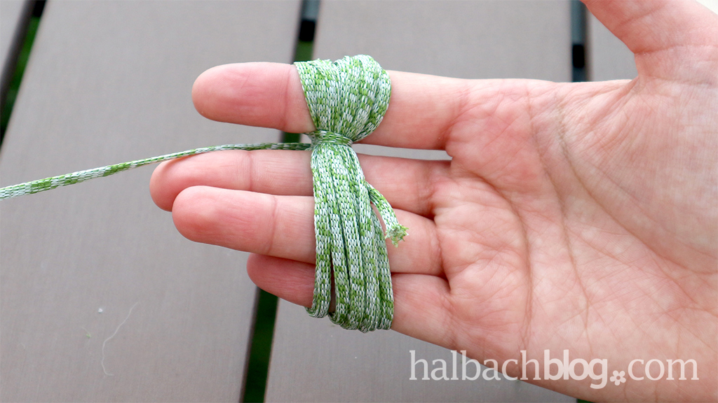 Ihr wickelt das Bändchen 15x so um eure Hand, wie auf dem Bild zu sehen. Wichtig ist, dass ihr anschließend die Kordel noch zwischen eurem Zeige- und Mittelfinger einfädeln könnt. An dieser Stelle wird die Quaste nämlich abgebunden (ca. 3-4 mal herum) und mit einem kleinen Knoten fixiert. Anschließend schneidet ihr die Kordel ab. Sie wird durch die Mitte der Schlaufen nach oben gezogen, so kann die Quaste daran schön gerade baumeln. Berücksichtigt beim Abschneiden auf welcher Höhe die Quaste hängen soll und schneidet nicht zu knapp ab.