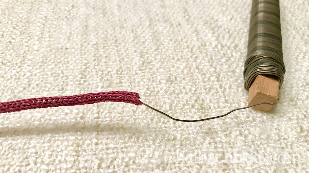 Fädelt den Draht in den Papierstrickschlauch. Wenn ihr etwas dickeren, stabileren Draht nehmt, ist das auch gar nicht so fummelig, wie man denken könnte. Biegt den Strickschlauch in die Form, die ihr aufsticken möchtet und fixiert ihn an zwei Stellen mit dem Stickgarn und der Nadel. Stickt ruhig drei-vier mal drüber und verknotet das Garn dann auf der Rückseite, sodass sich nichts mehr lösen kann.