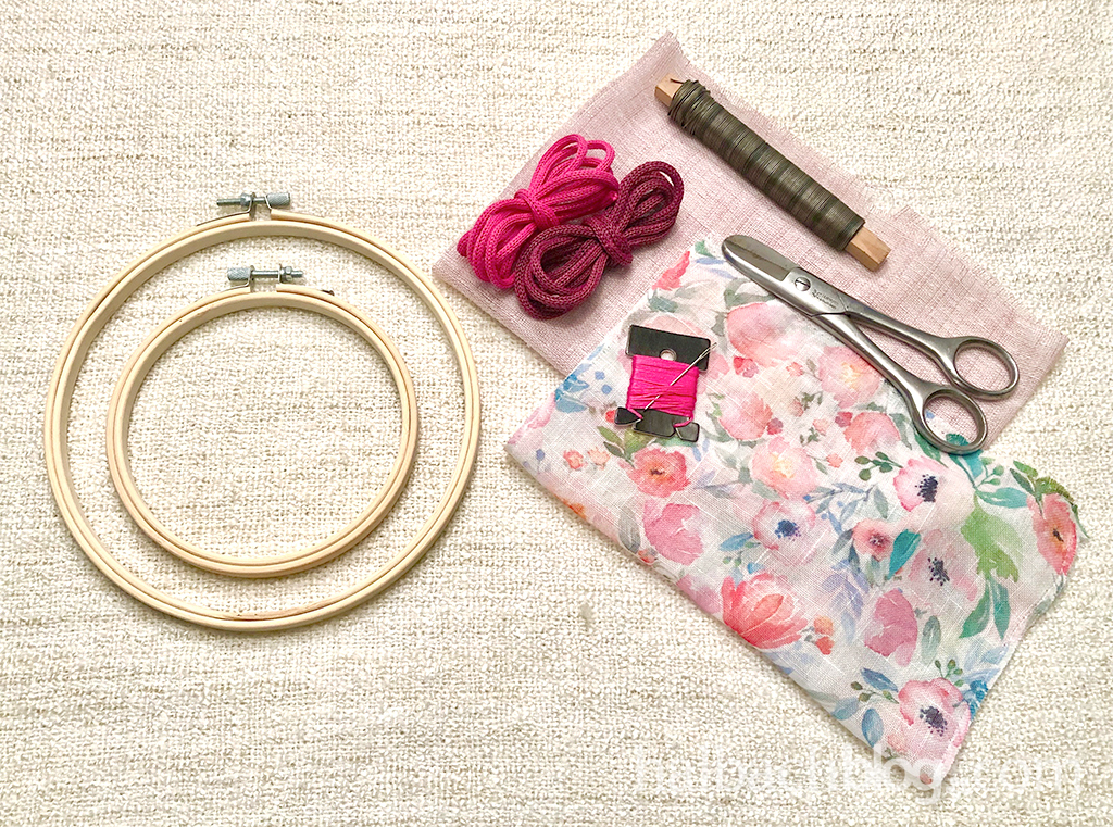 Bespannt die Stickrahmen mit dem Stoff und achtet darauf, den Stoff schön stramm zu ziehen. Schneidet anschließend die heraus schauenden Reste des Stoffes nah am Stickrahmen ab.
