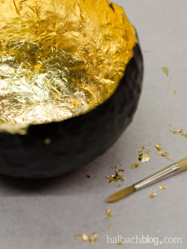 - die Innenseite mit den Schlagmetallstücken auskleiden, am besten vom Rand aus beginnen, dann kann beim Anlegen in der Mitte schon mal nichts mehr im oberen Bereich anhaften (wer schon mal mit Schlagmetall gearbeitet hat weiß, dass das dünne Material gerne schon beim kleinsten Windhauch auch mal ganz ungewollt die Richtung ändert und da landet, wo es gar nicht landen soll und was einmal klebt, das klebt …)
