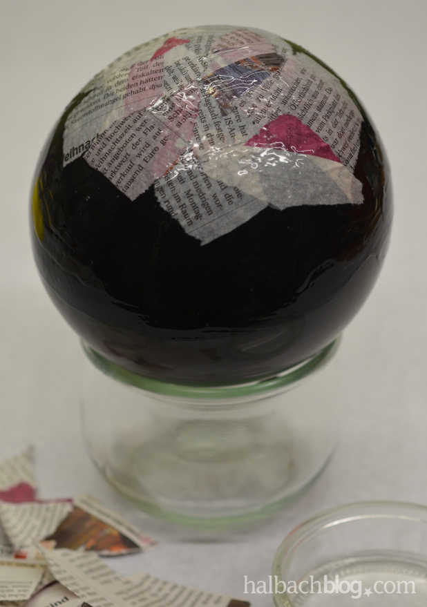 - den Ballon mit Kleister einreiben und schichtweise mit den Schnipseln belegen, nach jeder Lage neu mit Kleister einreiben (es müssen viele Schichten sein, damit das Windlicht stabil wird)