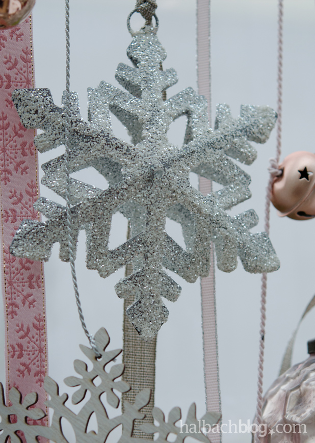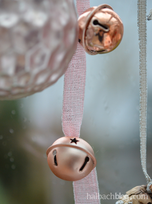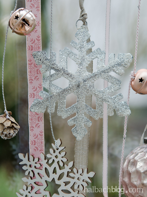- verschiedene Accessoires, zum Beispiel matte und glänzende Metallglöckchen in Roségold, Metall-Glitter-Schneekristalle, Holzschneekristalle, Filzaccessoires mit Perlenrand, Glaskugeln und beschneite Zapfen