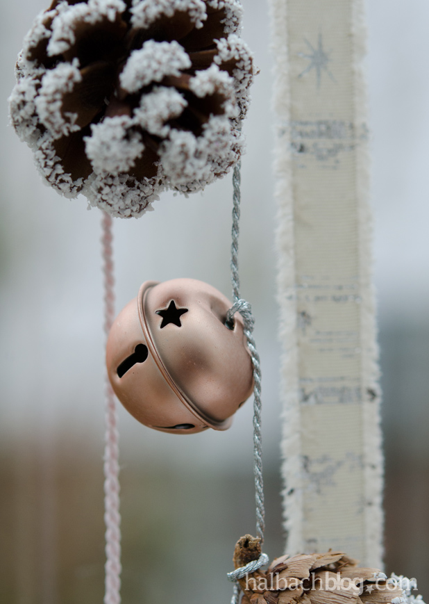 - die Accessoires in unterschiedlichen Höhen anknoten (die Metallglöckchen halten auch ohne Knoten, wenn sie auf ein breiteres Band geschoben werden), ruhig manche Bänder mit mehreren Accessoires bestücken