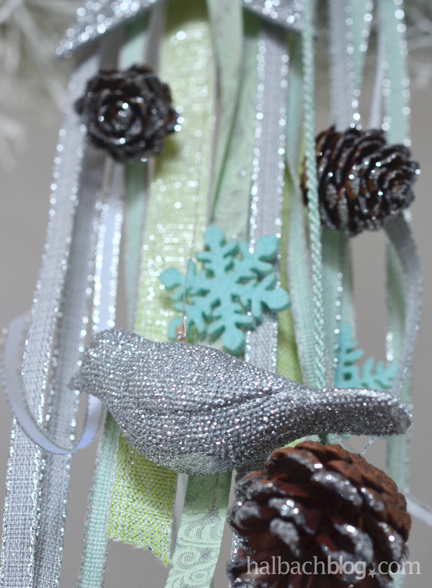 Zuerst habe ich eine dünne Kordel für die Aufhängung angebracht. Dann die Bänder nebeneinander gelegt und locker um den Kranzkörper geknotet. Filzschneekristalle in Mint mit einem Heißklebepunkt auf die Bänder kleben. Die anderen Accessoires an dünnere Kordeln knoten. Ein paar beglitterte Zapfen geben Glanz aber auch eine natürliche Note. Echte Highlights sind Glitzersterne und -vögel. Sie setzen winterlich-funkelnde Akzente und machen den frostigen Look perfekt, oder?